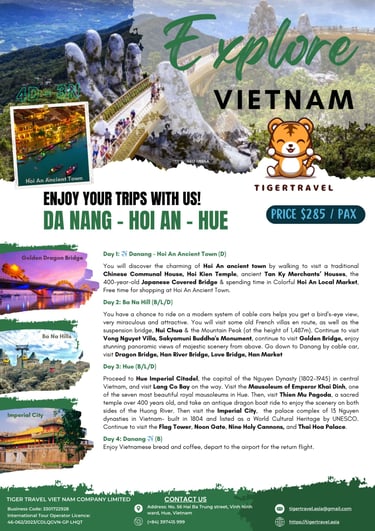 Da Nang Hoi An Hue Tour will bring you wonderful and unforgettable memories in the Central of Vietnam. You will get knowledge about the former capital of Vietnam - Hue city including Imperial City, Royal Tombs and Thien Mu Pagoda. In addition, you will be excited by Hoi An Ancient Town with old multi-culture houses and colorful lanterns. Furthermore, you will enjoy many exciting activities at Ba Na Hills and contemplate the beautiful scenery of Da Nang City including Marble Mountains and Linh Ung Pagoda.
